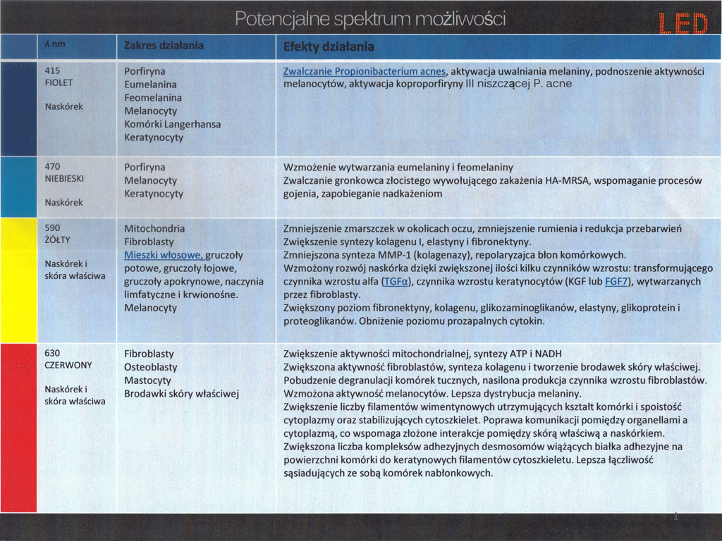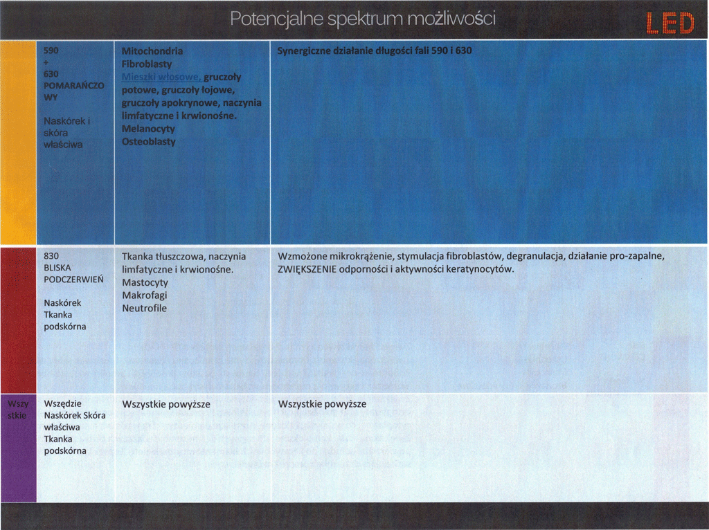 Lampa LED to urządzenie mieszające różne barwy światła (fioletowe, niebieskie, żółte, czerwone), mające bezpośredni wpływ na procesy starzenia, choroby skóry i gojenie ran pozabiegowych.
